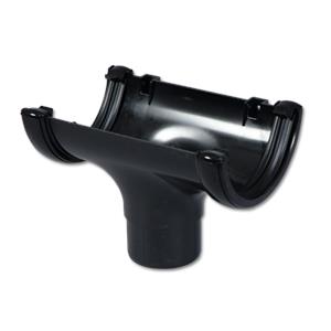 The Half-Round Gutter Run Outlet (Black) is a gutter accessory that connects a half-round gutter to a downpipe, allowing rainwater to flow from the gutter into the drainage system. Made from durable materials like PVC or metal, it is black for a clean, modern look and ensures a leak-free, smooth water transition from gutter to downpipe.