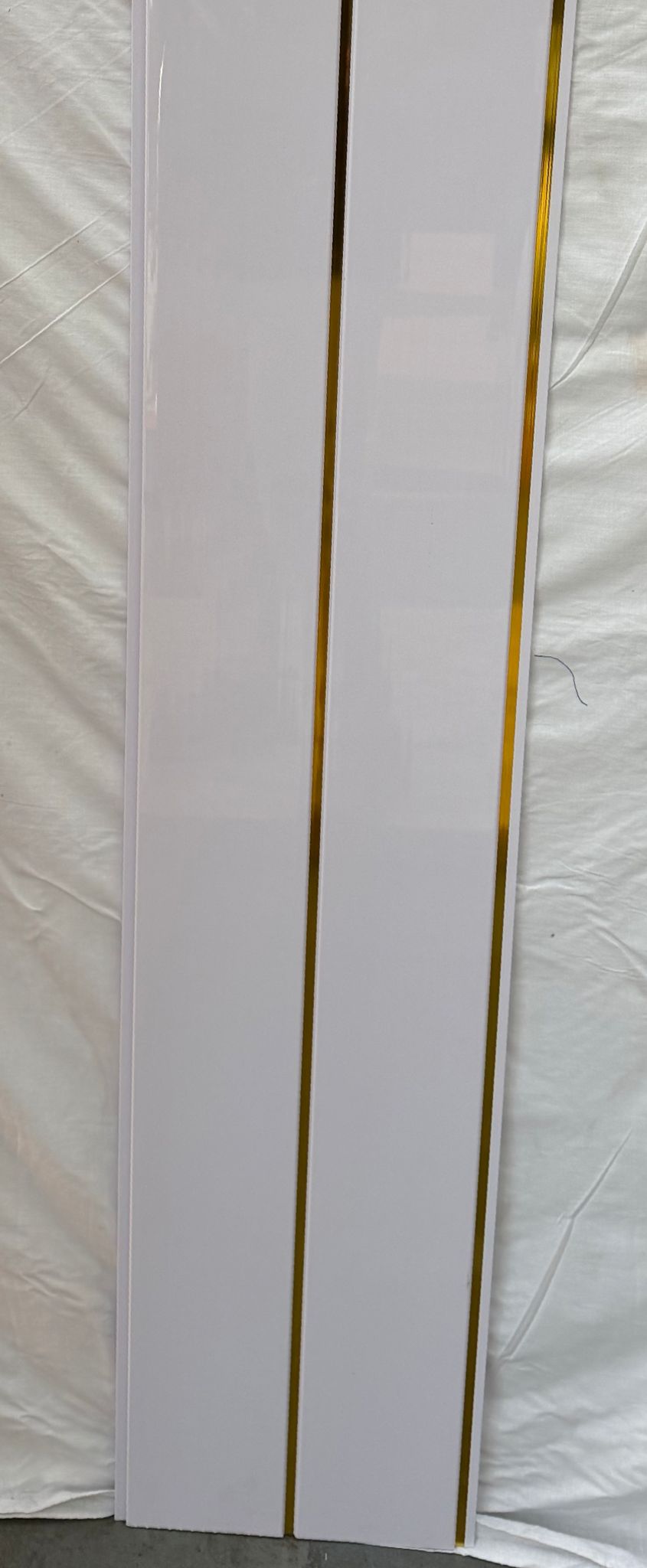 A decorative wall cladding profile with a high‑gloss white finish and a single recessed groove running along the center.
