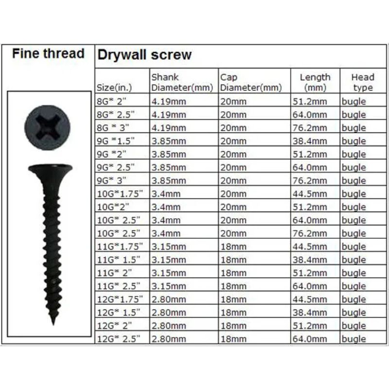 The proper black fine-thread drywall screws you fit all day long. Sharp piercing point, deep Phillips drive and bugle head that pulls flush without tearing the paper. Black phosphate finish for corrosion resistance.