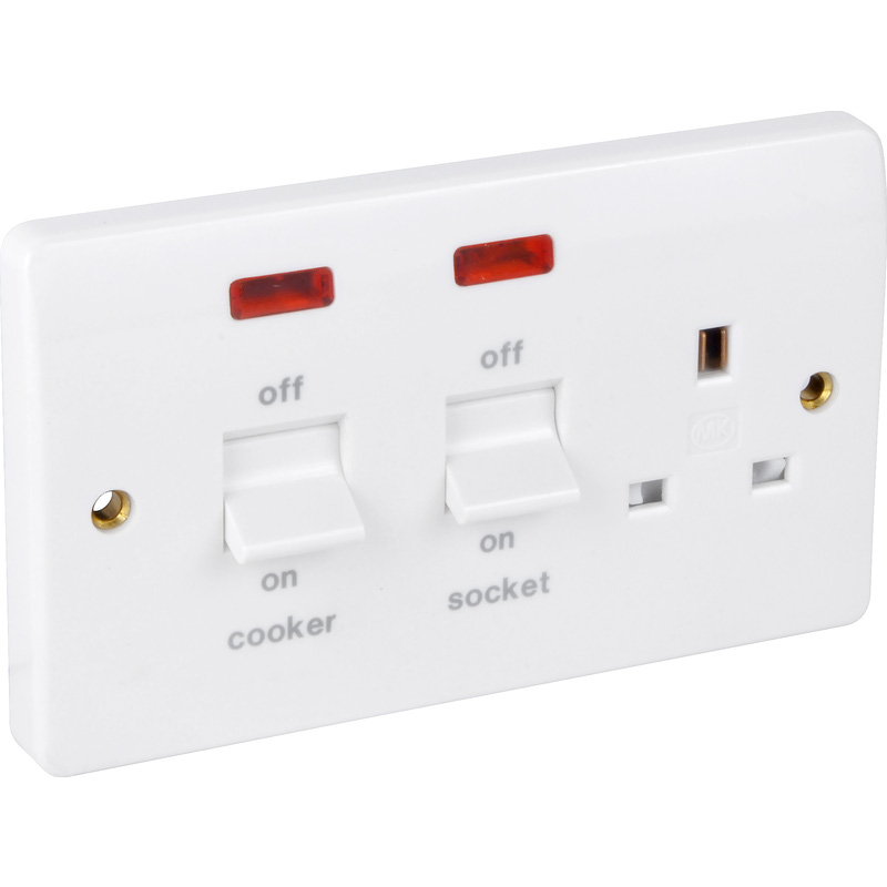 Based on general knowledge, the MK 45A Cooker Unit 45A DP Switch & 13A Socket Neon is a kitchen electrical unit that combines: