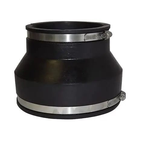 One end fits clay pipes, the other plastic pipes, allowing different materials to join securely.